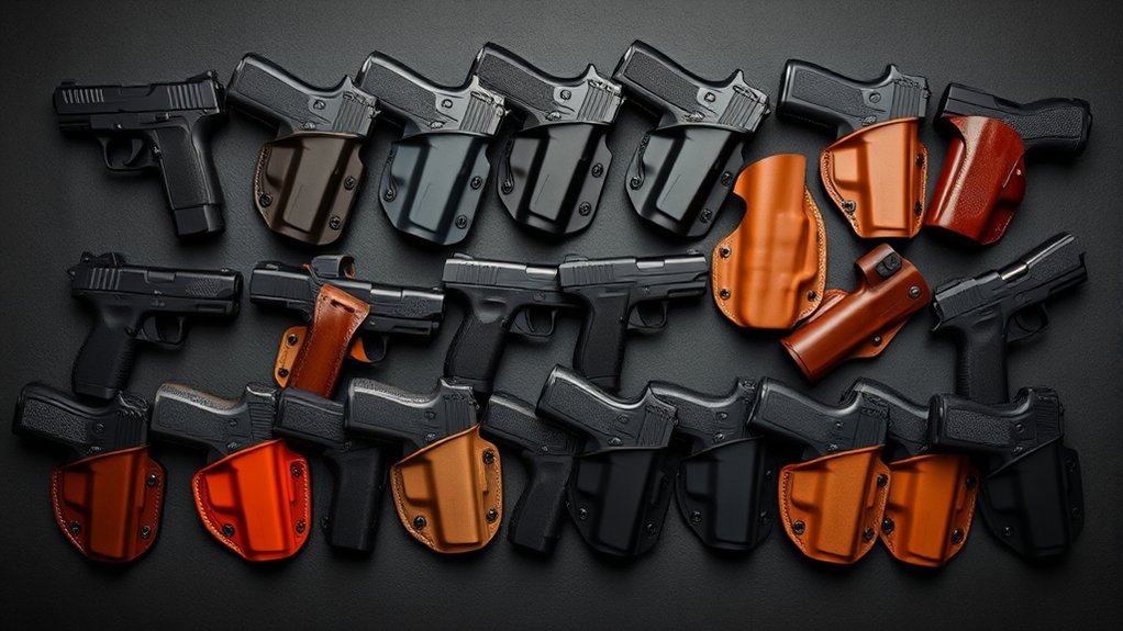 Proper adjustability prevents firearm movement, minimizing discomfort and boosting your confidence while carrying. Holsters with adjustable retention locks and cant angles accommodate various body types and carry preferences, improving concealment and accessibility. By modifying fit and carry position, you’ll avoid pinching, rubbing, or printing, making your concealed carry discreet and comfortable.