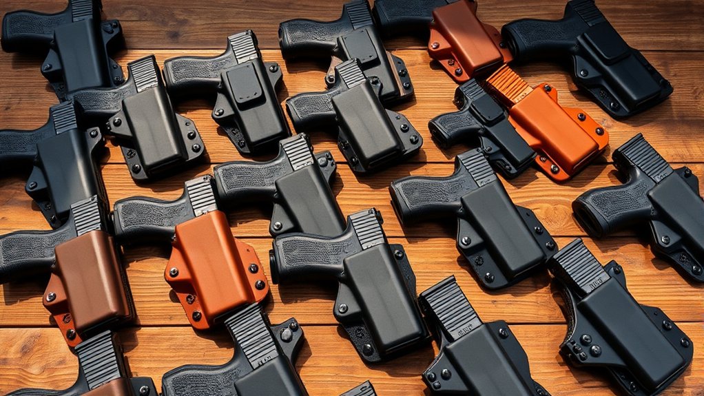 If you want your Glock 42 holster to fit your unique carry style, look for adjustable features that let you fine-tune retention, cant angle, and ride height. Adjustable retention screws let you customize the grip on your firearm, guaranteeing it’s secure yet quickly accessible. Most holsters offer cant angle adjustments from 0 to 30 degrees, so you can position your Glock for maximum comfort and ease of draw.
