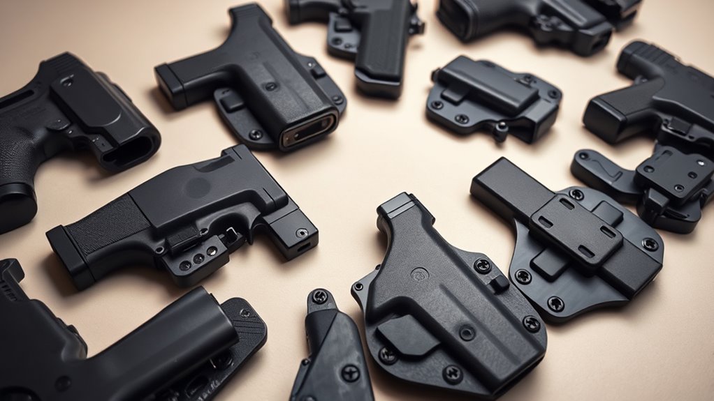 Durability matters too—American-made Kydex and reinforced nylon resist fatigue, maintaining secure retention. Texture and flexibility influence how well the holster hugs your body and disappears under clothing. Pick a material that balances shape, movement, and concealment for reliable everyday carry.