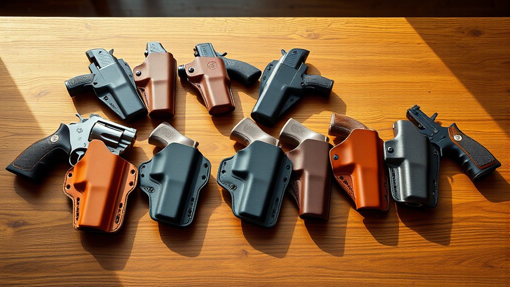 You’ll want a holster that fits your J-Frame revolver’s 2.5-inch barrel perfectly for comfort and quick access. Options like the Kosibate IWB offer lightweight suede leather, while the 1791 Gunleather provides durable American steerhide with reinforced stitching.