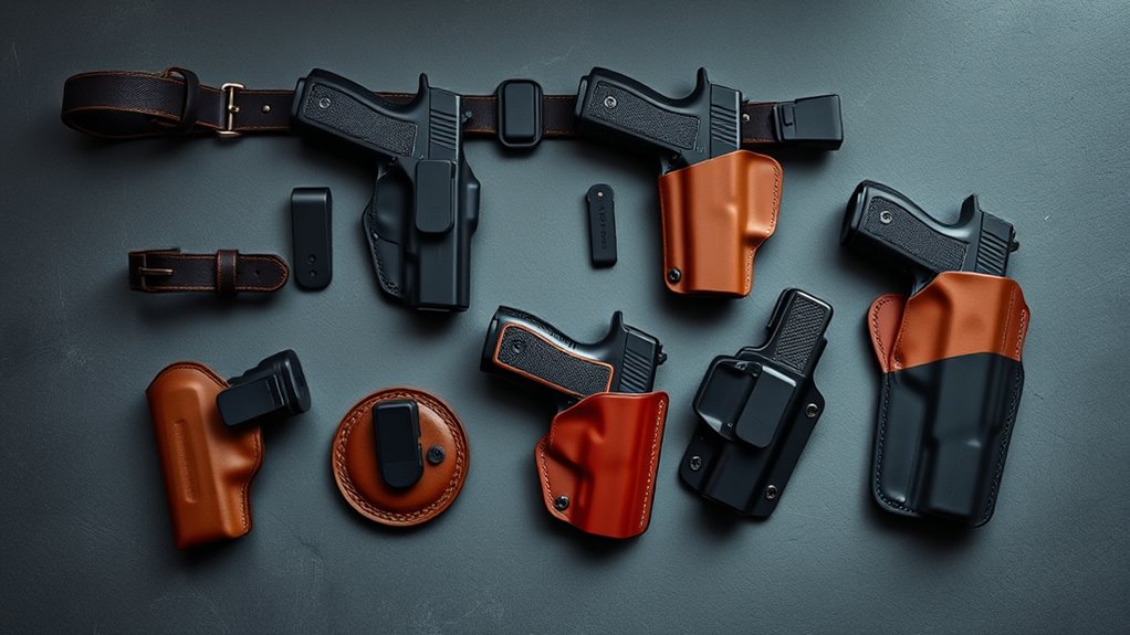 Expect secure retention, adjustable cant and ride height, and quick-draw features. From Kydex to premium leather, many styles suit your carry position and comfort—keep exploring to find your perfect match.