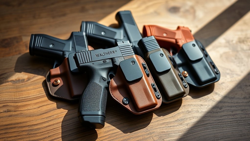 Durability plays an essential role in choosing the best holster for your Walther PDP. You’ll want a holster made from high-quality materials like .08″ Kydex, which offers excellent resistance to wear, moisture, and sweat while staying lightweight. This guarantees your holster maintains its shape, providing consistent retention and safety even after repeated use.