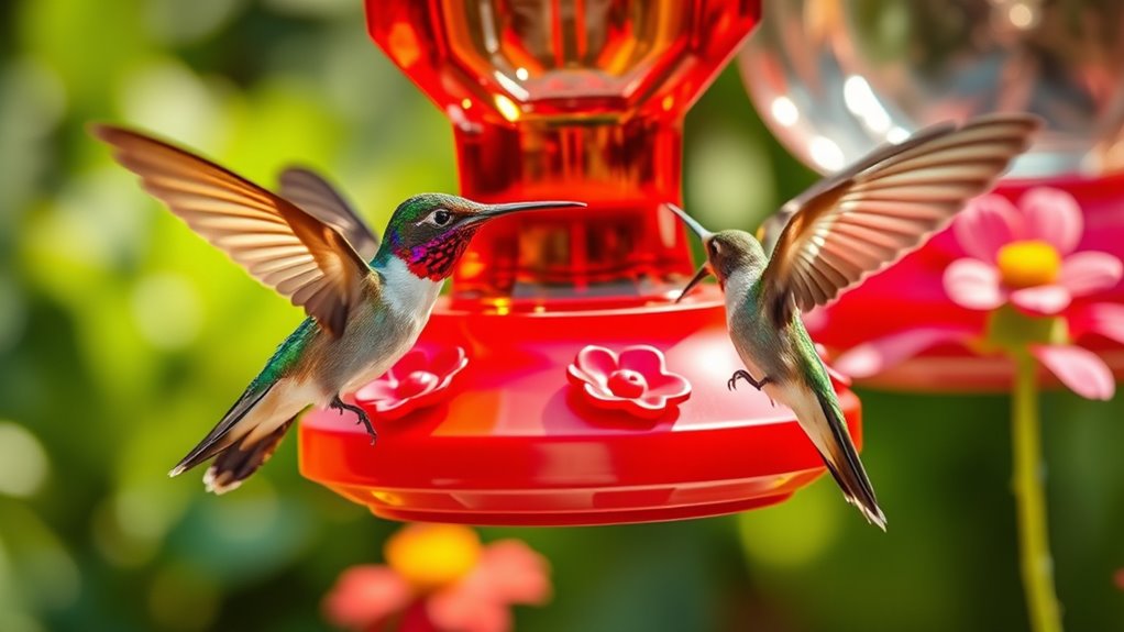 A sealed or wide-mouth base can minimize spillage, reducing the chance pests get attracted. Regularly maintaining the feeder, especially cleaning around the feeding areas, helps avoid mold and pest buildup. By selecting feeders with these features, you guarantee your hummingbirds enjoy clean, uncontaminated nectar, and you keep unwanted visitors at bay, making your feeder a safe and attractive spot for hummingbirds.