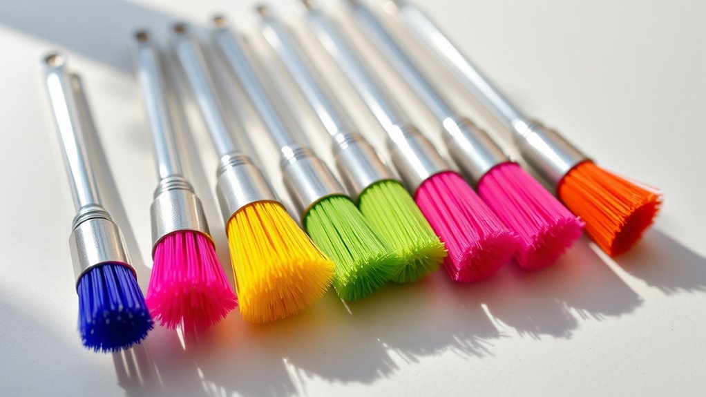 Choose brushes with durable handles that can be hung on hooks, preventing damage and maintaining organization over time. Opt for sets that include multiple brushes with different sizes, stored together neatly in a designated container or hanging system. Confirm the storage method allows brushes to dry completely, reducing the risk of mold or bacterial growth and keeping your tools ready for next use.