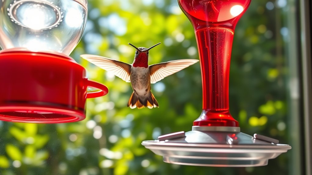 The number of ports matters too; more ports mean multiple birds can feed at once, so choose based on how many visitors you want to accommodate. Also, flexible or soft feeding ports are gentler on hummingbirds’ beaks, encouraging longer, more frequent visits. By considering these factors, you’ll ensure your feeder not only draws in hummingbirds but also provides a comfortable, accessible feeding experience right at your window.