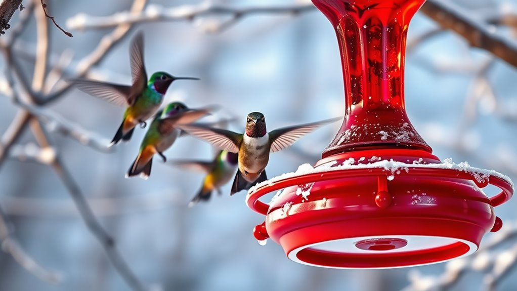 You’ll want a heated hummingbird feeder that keeps nectar from freezing, even in harsh winter weather. Look for durable, shatterproof designs with four feeding ports so multiple birds can enjoy at once.