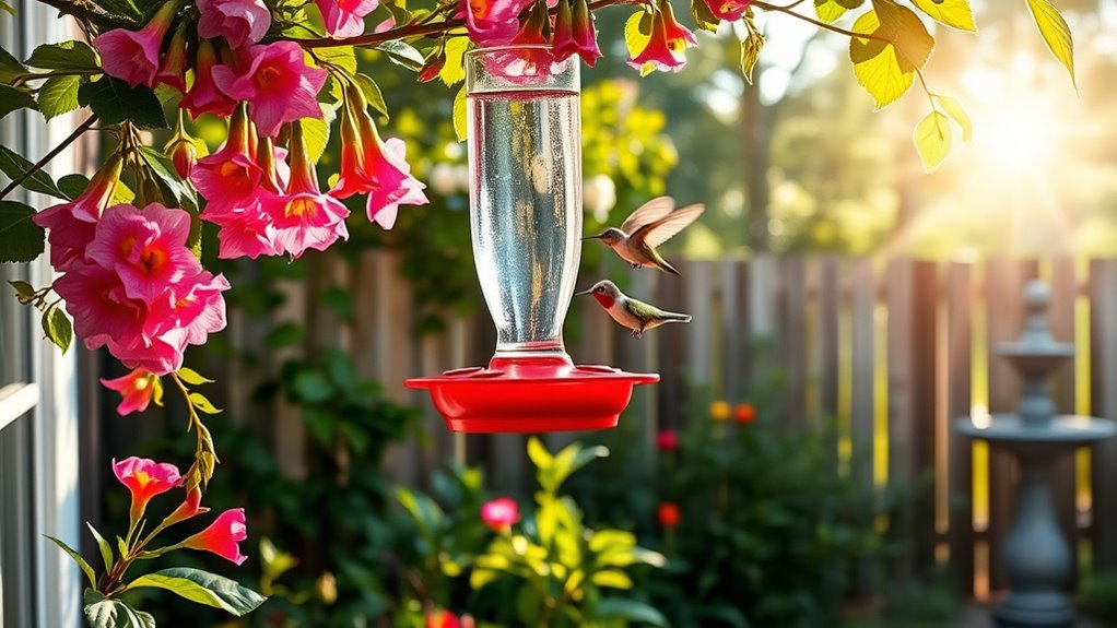Just be mindful to provide some shade during the hottest parts of the day to prevent nectar from fermenting too quickly. Balancing sunlight exposure ensures your feeder stays fresh and inviting for hummingbirds throughout the prime feeding times.