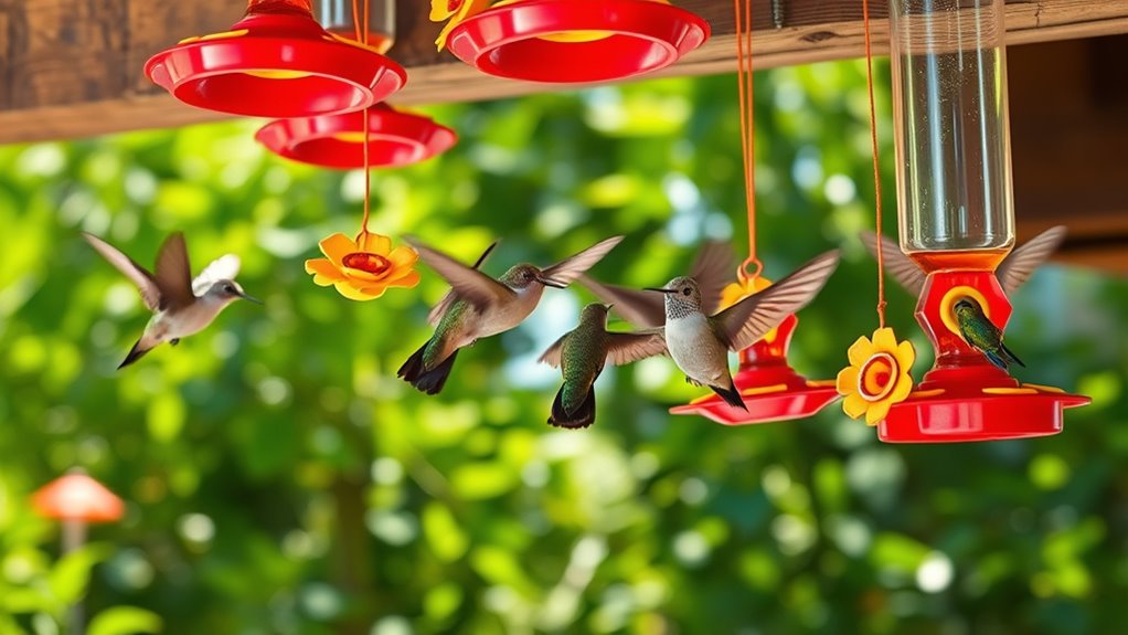 Feeders featuring bright colors and multiple feeding ports attract birds while preventing pests.