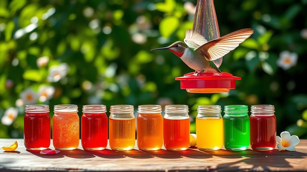 How does nectar color influence hummingbird attraction? The color of nectar, especially red, plays a vital role because it mimics the vibrant hues of natural flowers, helping hummingbirds spot food quickly. When you choose nectar mixes, you might notice some contain added dyes to boost red coloration.