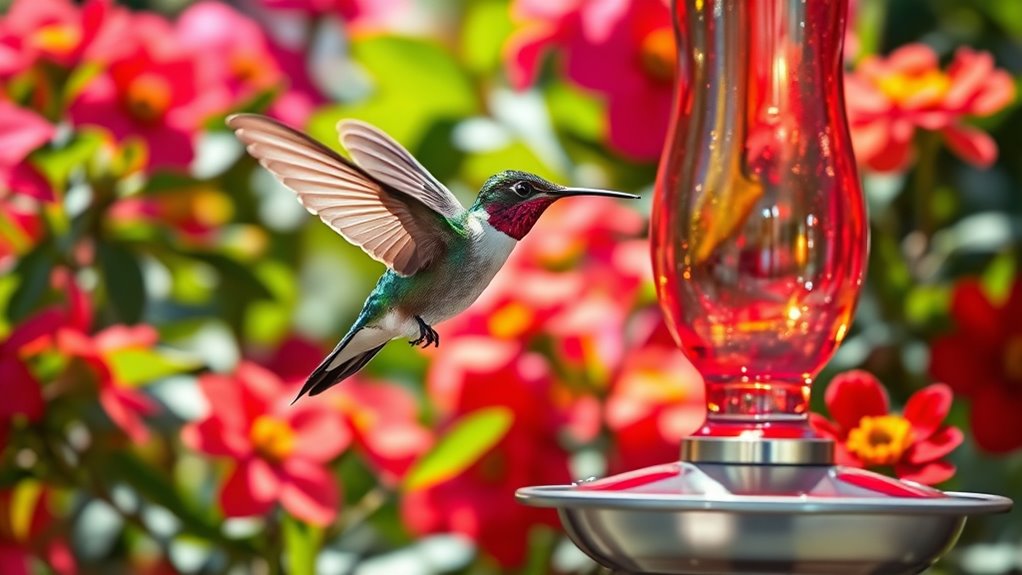 Incorporating natural flower-like shapes and colors in your feeder design or nectar presentation further boosts their interest. Remember, keeping your feeder consistently clean with fresh, visually appealing nectar ensures hummingbirds keep coming back, favoring your feeder over other food sources. Focusing on these visual and maintenance factors will help you create an irresistible hummingbird haven.