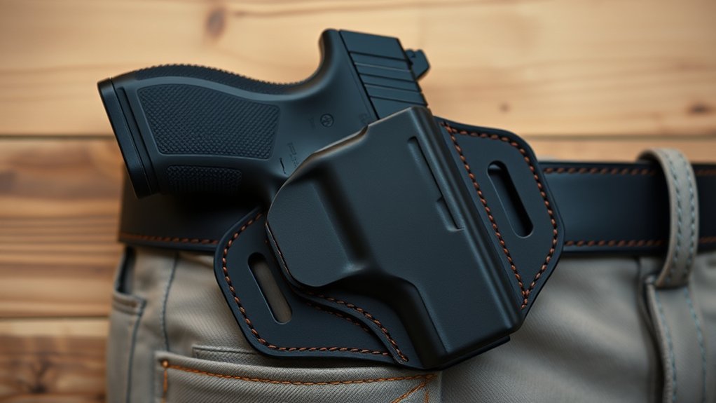 Investing in high-quality materials means your holster won’t warp or lose its fit, giving you reliable daily carry without frequent replacements. Ultimately, durable material choices provide peace of mind that your Shield Plus stays secure and comfortable throughout the day.