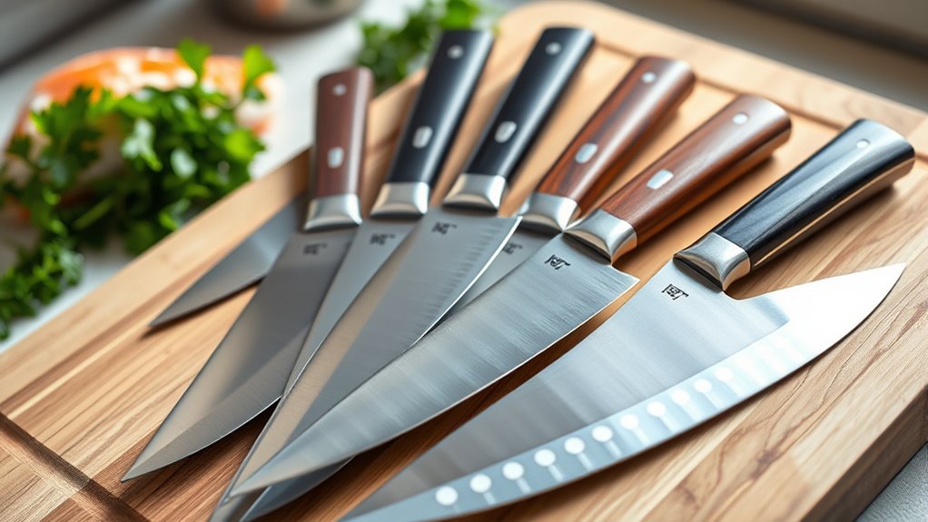You’ll want sharp, flexible blades made from high-carbon Japanese or German stainless steel for durability and corrosion resistance.