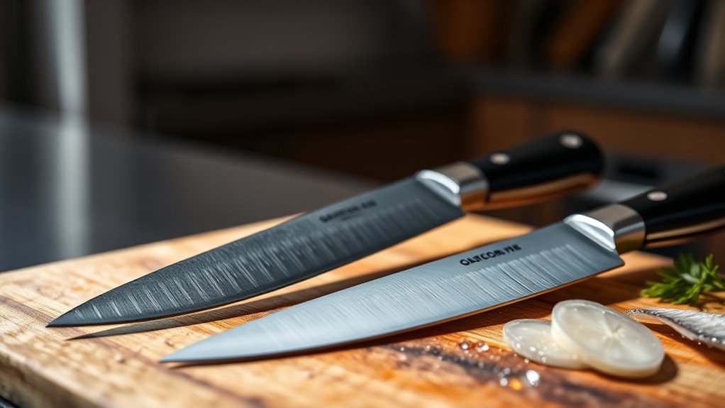 A well-designed handle also distributes pressure evenly across your hand, minimizing discomfort and strain. By focusing on handle comfort, you’ll enjoy safer, more precise filleting without unnecessary fatigue or risk of slipping.