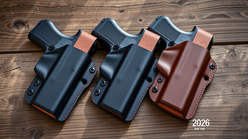Urban Carry’s LockLeather OWB holster stands out for strong retention and accessory compatibility. Each delivers reliable concealment and quick access, and there’s more to explore about what makes these top picks stand out.