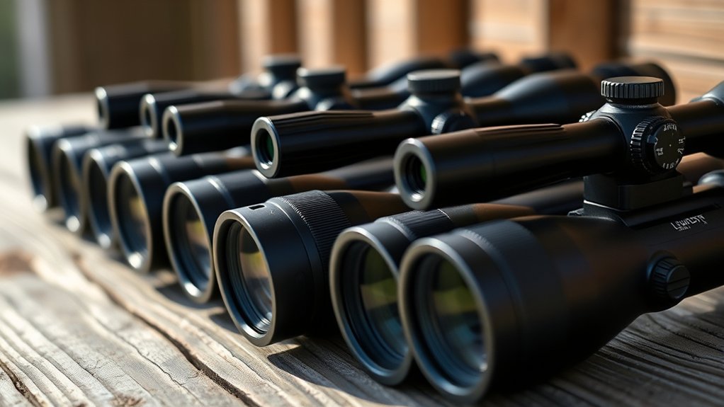 Scratch-resistant lens coatings and rugged housing protect your investment, maintaining optical clarity over time. Plus, low-profile locking mechanisms and corrosion-resistant finishes add to long-term reliability. Choosing a Leupold scope with these durable construction elements means you’ll have a dependable tool ready for any adventure, season after season.