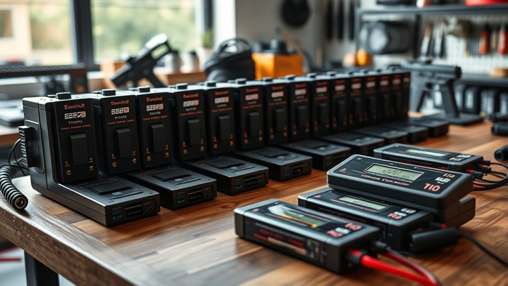 You’ll want a LiPo charger that offers built-in voltage meters and balances cells safely to extend your airsoft battery’s lifespan.
