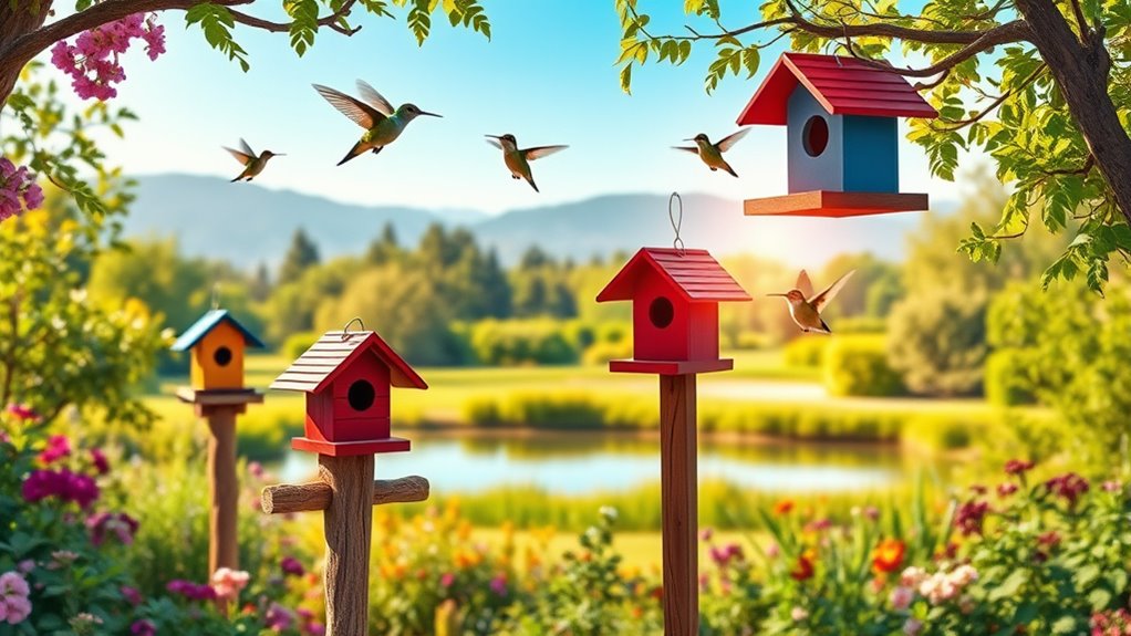 Use natural materials and make certain good airflow to prevent moisture buildup. Positioning houses this way encourages nesting and easy monitoring—you’ll find even more tips to create the perfect hummingbird habitat ahead.