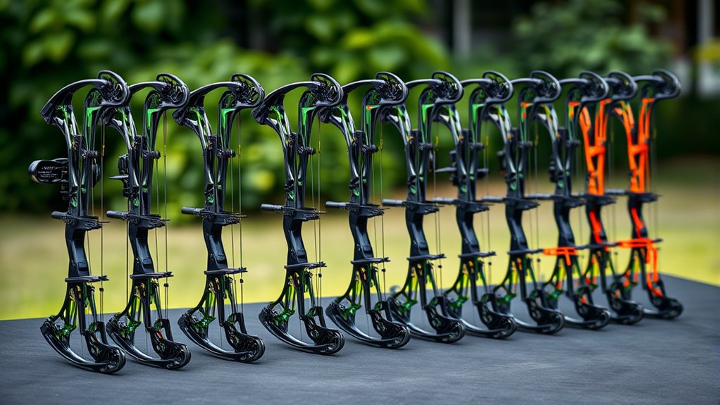 Many compound bows let you adjust the draw length from 16 to 31 inches, giving you the flexibility to tailor your setup for comfort and performance. This adjustability is essential for achieving ideal shooting form, as it lets you customize the bow to fit your body size and shooting style.