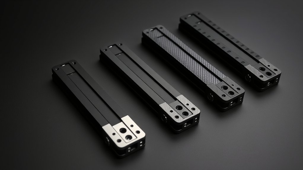 Because your M-LOK Arca rail needs to endure tough conditions, you should prioritize materials that balance strength, weight, and corrosion resistance. Aluminum is a popular choice, especially CNC-machined aluminum, as it offers a lightweight yet sturdy build that holds up well outdoors. Hard anodized finishes further protect aluminum rails from corrosion, extending their lifespan.
