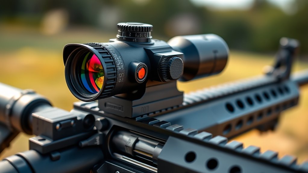 Look for waterproof and fog-proof features like IPX ratings and nitrogen purging to keep your optics clear and functional in wet or humid conditions. Shock resistance is essential, too—it guarantees your setup stays zeroed even after rough impacts. Robust sealing with O-rings prevents water and fog from compromising clarity over time.