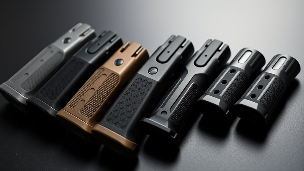 You’ll want a surface that maintains a firm hold even if your hands are wet, sweaty, or gloved. Materials like rubber and nylon offer different tactile sensations, affecting both comfort and security. Opting for a low-profile texture can enhance ergonomics without adding bulk, preserving your rifle’s balance and handling.