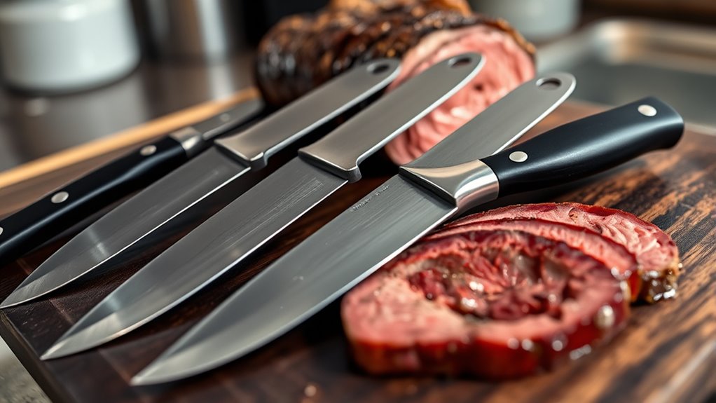 Although many factors influence a meat knife’s performance, blade material quality plays a crucial role in sharpness, durability, and corrosion resistance. You’ll want a blade made from high-carbon stainless steel, as it balances these qualities effectively. Whether forged or stamped, premium steel ensures consistent edge retention and makes sharpening easier.