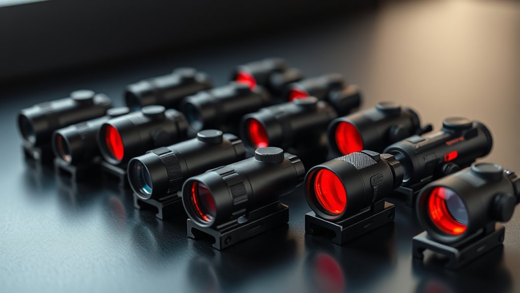 Some sights let you switch between reticle styles, giving you flexibility based on your shooting needs. The size of the reticle affects visibility; smaller dots improve accuracy, larger ones speed up sighting. Many advanced models also feature adjustable brightness and night vision compatibility to maintain clarity in various lighting.
