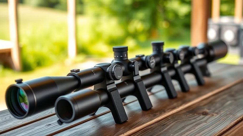 While optical clarity guarantees you see your target clearly, durability and weather resistance keep your scope performing no matter the conditions. You want a scope made from aircraft-grade aluminum to handle rough use and recoil without damage. Look for features like fog-proof, waterproof, and shockproof designs to guarantee your scope works reliably in rain, dust, and impact.