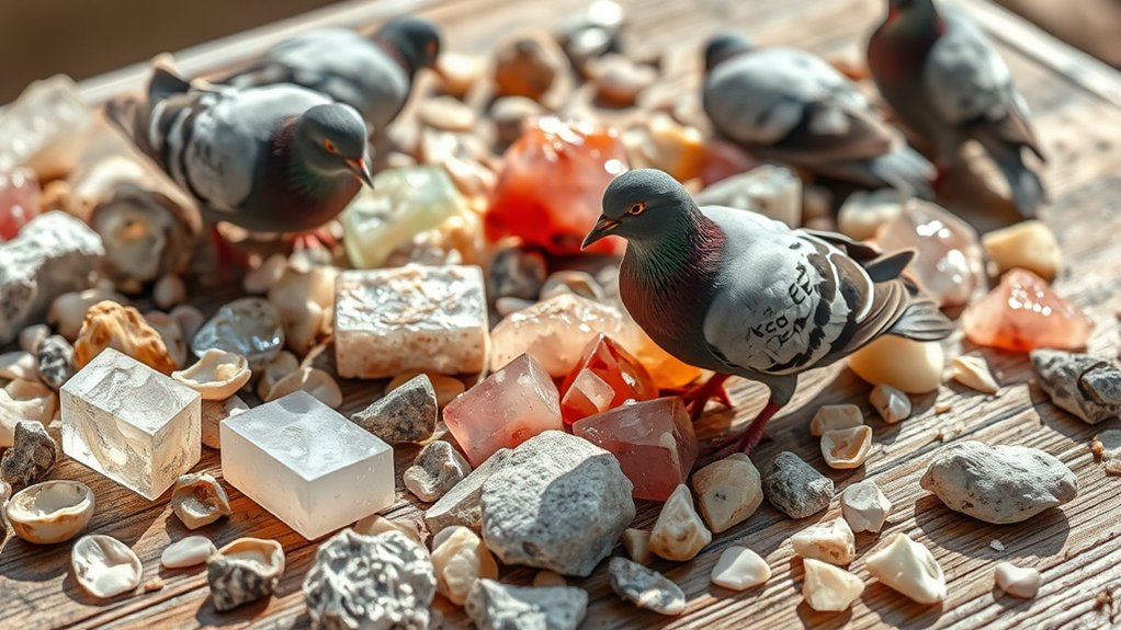 Also, look for natural ingredients like oyster shells and charcoal; they aid digestion and purify the digestive tract, making mineral absorption more effective. By selecting a mineral mix with these components, you’ll provide extensive support that keeps your pigeons healthy and strong.
