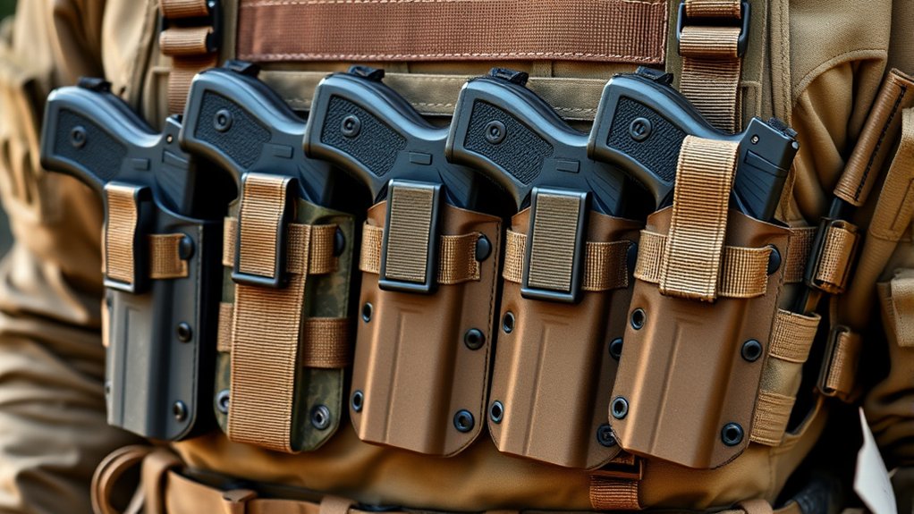 Choose holsters compatible with MOLLE gear, belts, or drop-leg setups for flexible carry options. Lightweight, low-profile designs guarantee comfort without sacrificing security.