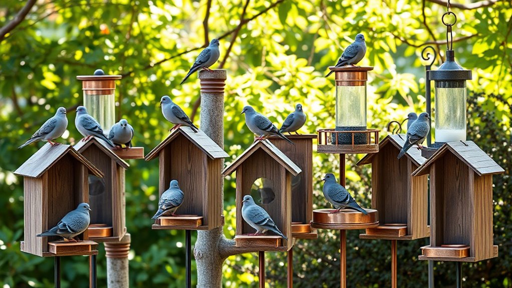 You’ll find options like rot-resistant cedar hanging feeders, ground feeders with 5 LBS capacity, rainproof designs, and easy-refill trays that deter squirrels.