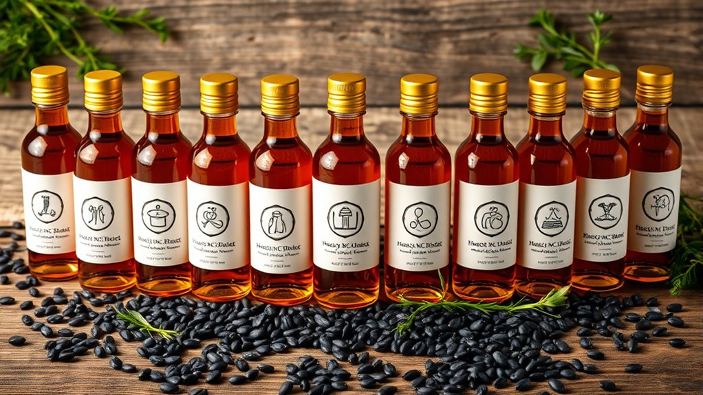 Premium black seed oils, especially those from trusted sources, can contain up to five times more thymoquinone than standard options, making them more potent. To guarantee you’re getting a high-quality product, look for oils extracted through cold-pressing, which preserves thymoquinone and other beneficial compounds.