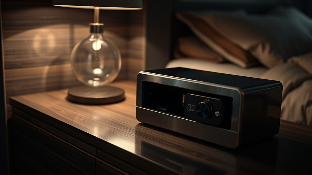 To protect your nightstand setup, you’ll want security features that match real-world use. You should look for multiple access methods—biometric fingerprint, digital PIN, and a mechanical key—for versatile security and backup. Alarm systems that alert you to unauthorized attempts or tampering improve safety and response time.