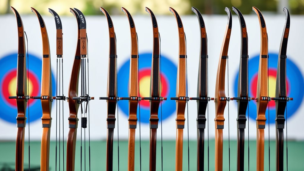 Adjustable draw weight plays a crucial role in your journey as a beginner archer, letting you start with manageable resistance and gradually increase it as your strength and technique improve. Most Olympic recurve bows offer draw weight settings typically ranging from 20 to 40 pounds, giving you flexibility to match your current ability. This modifiability helps prevent injury by ensuring the bow’s resistance isn’t too much, promoting proper shooting form.