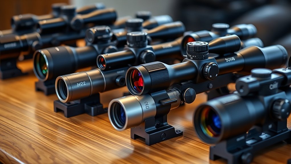 Keep in mind, illuminated reticles, whether red or green, impact battery life and clarity, so choose one that balances visibility with endurance. Ultimately, your reticle choice should match your shooting pace and accuracy needs, giving you confidence and speed when every split second counts.