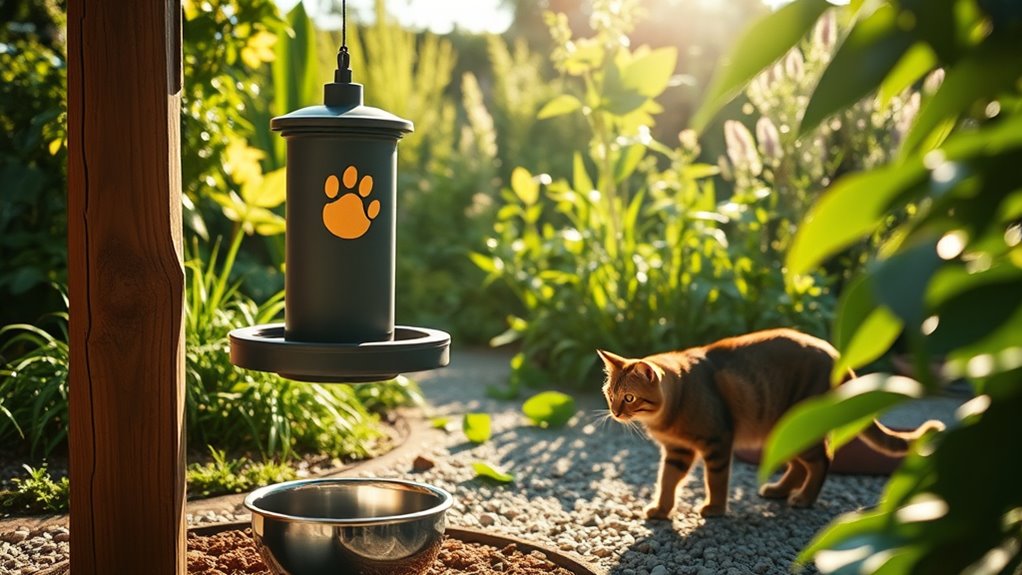 If you’ve got multiple cats, dual feeding ports can streamline mealtime by letting everyone eat at once. With two access points, you reduce competition and stress, so mealtimes stay calmer. Separate ports prevent food disputes by giving each cat its own station, which is especially helpful outdoors where distractions abound.