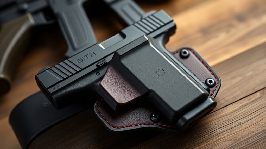 High-quality holsters often include corrosion-resistant hardware and reinforced edges, ensuring they stay reliable over time. Prioritizing durable, comfortable materials means you’ll have a holster that not only protects your firearm but also feels good against your skin throughout the day.