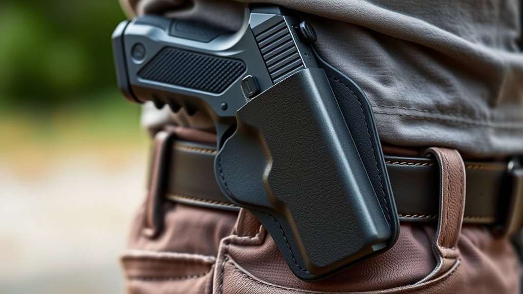 Durable materials like Kydex or leather guarantee lasting use, while sweat guards and trigger protection improve safety. With various quick-attach systems available, you can customize your carry easily.