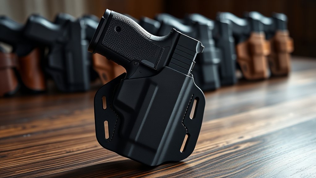 Retention and security features are essential for keeping your Sig P365XL safely in place during carry. Adjustable retention screws and locking mechanisms, whether passive or active, help guarantee your firearm stays secure. You can customize the tension to find the right balance between easy draw and security, minimizing the risk of accidental discharges or loss.