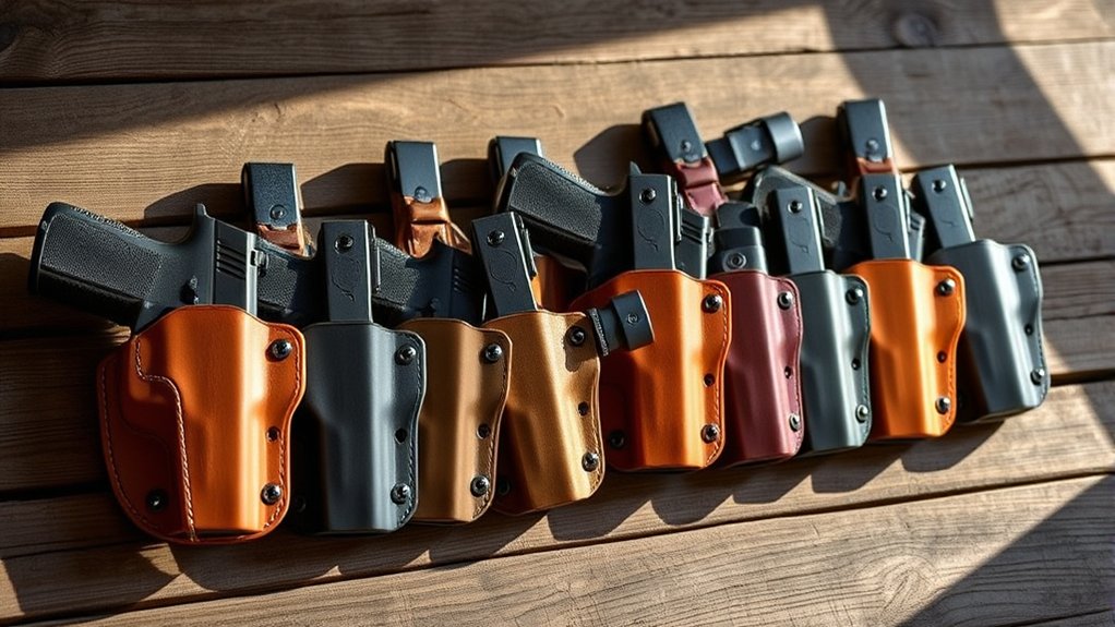 You’ll want holsters made from durable materials like Kydex or reinforced polymer for all-weather use. These materials resist moisture, heat, and wear, keeping your firearm secure and dry.