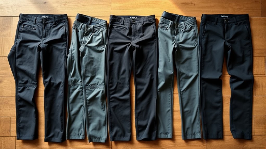 Consider water-resistant fabrics to protect your firearm and pants from moisture in various weather conditions. Lightweight ripstop fabric offers durability without added bulk, helping you move freely. Also, pick pants that maintain their shape and resist wrinkling to guarantee a professional look and long-lasting performance.