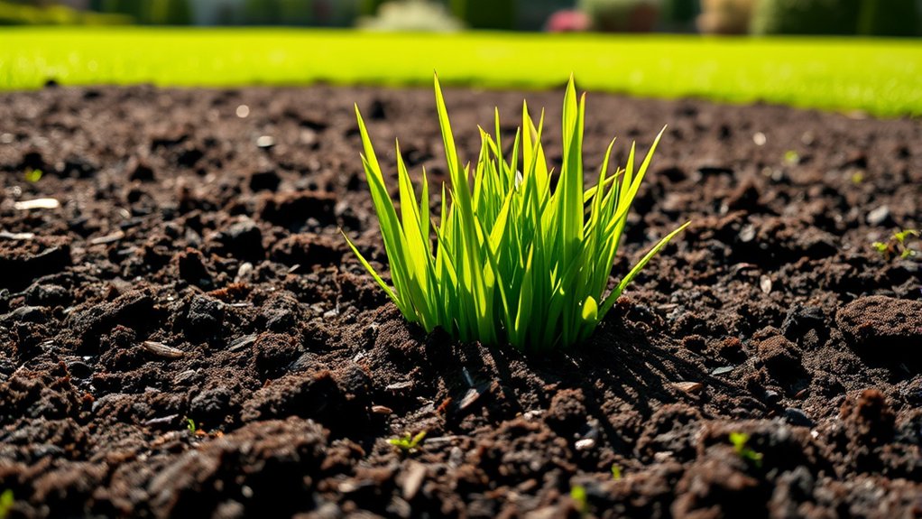Its organic structure helps retain moisture, guaranteeing your grass seed stays consistently moist without overwatering. Since peat moss has a slightly acidic pH, it can balance soils that are too alkaline, creating favorable conditions for many grass types.