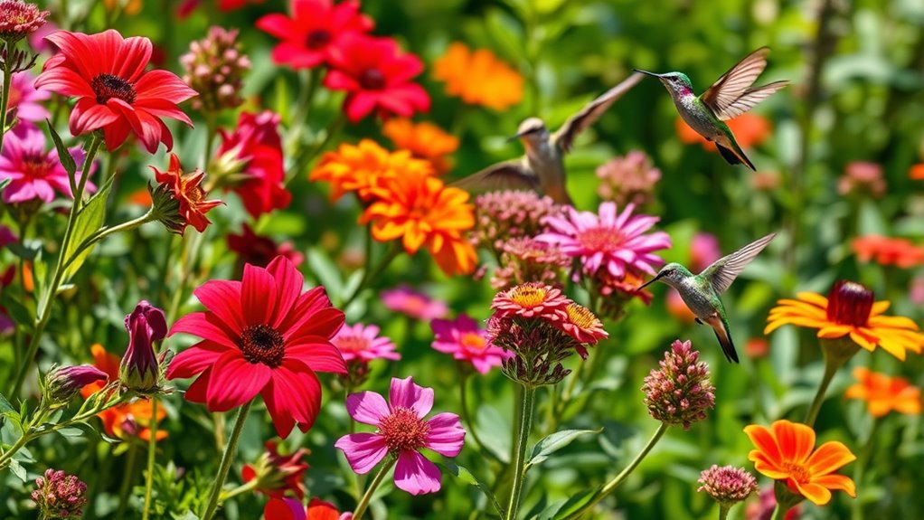 Don’t overlook flowers with contrasting markings or nectar guides—they act like signs, helping hummingbirds pinpoint where to feed. Intensity and vibrancy matter too; the more vivid the bloom, the more likely you’ll attract these tiny visitors. By selecting flowers with the right shape and striking colors, you’ll create a hummingbird-friendly garden that invites these energetic pollinators back again and again.