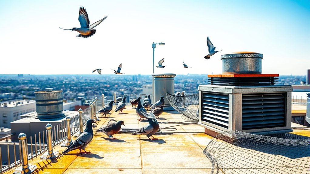 Combining visual deterrents with other methods like sound or scent can further improve results by preventing habituation. When selecting visual deterrents, focus on those that simulate threats or disruptions, ensuring your roof remains an unattractive spot for pigeons to roost or nest.