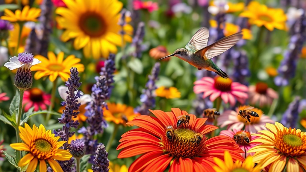 Mixing flower colors can attract both bees and hummingbirds, but timing your plant choices guarantees they find nectar all year long. By selecting plants that bloom at different times, you ensure a steady food source from early spring through late fall when pollinators are most active. Pay attention to peak blooming periods so your garden consistently offers nectar, supporting healthy pollinator populations.