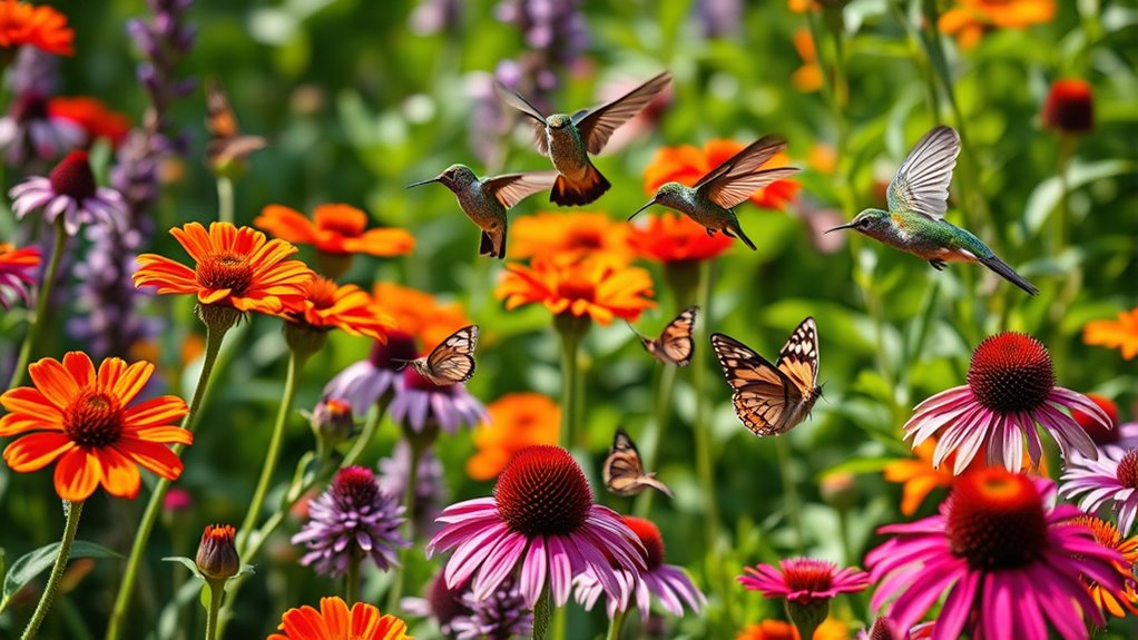 To attract butterflies and hummingbirds in 2026, choose vibrant, nectar-rich plants like Purple Coneflowers, Black-Eyed Susans, and tubular red or orange flowers that suit your region’s climate. Mix annuals and perennials for continuous blooms from spring through fall, ensuring plenty of nectar and varied heights for feeding and perching.