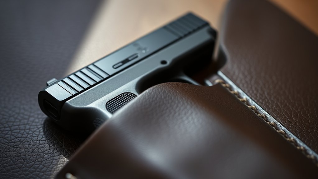 Always check the holster’s compatibility with your specific model to guarantee safe, reliable carry. Don’t assume all pocket holsters will work universally.