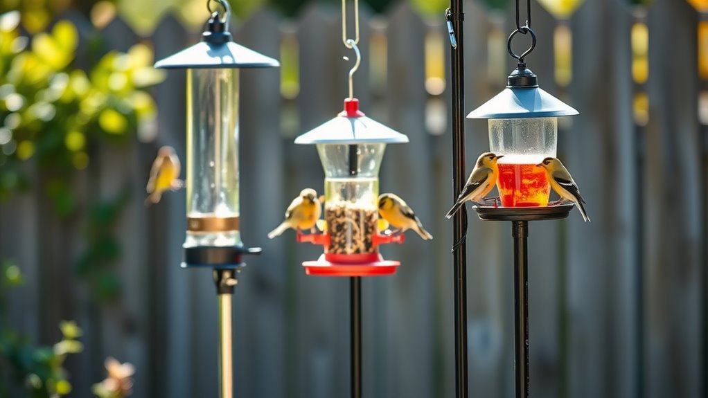 When choosing a pole-mounted feeder, consider mounting versatility, so you can adapt to different poles and placements. Think about seed capacity and how often you’ll fill it, along with weather protection to keep seed dry.