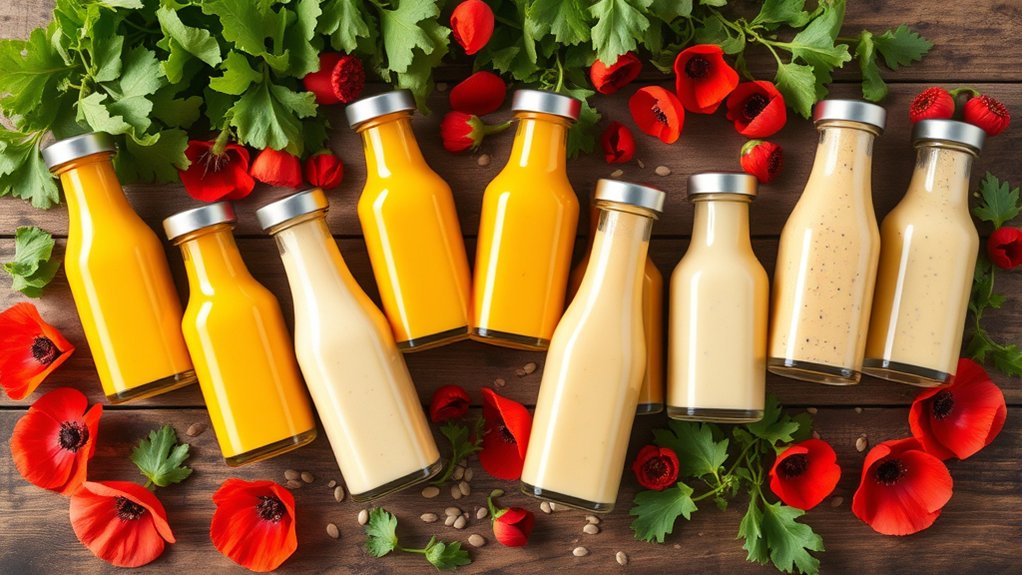 Exploring the flavor profiles of store-bought poppy seed dressings reveals a wide spectrum, from creamy sweetness to tangy nuttiness, each suited to different dishes. You’ll find some dressings infused with fruit flavors like raspberry or citrus, adding a revitalizing twist that balances salads or dips perfectly.