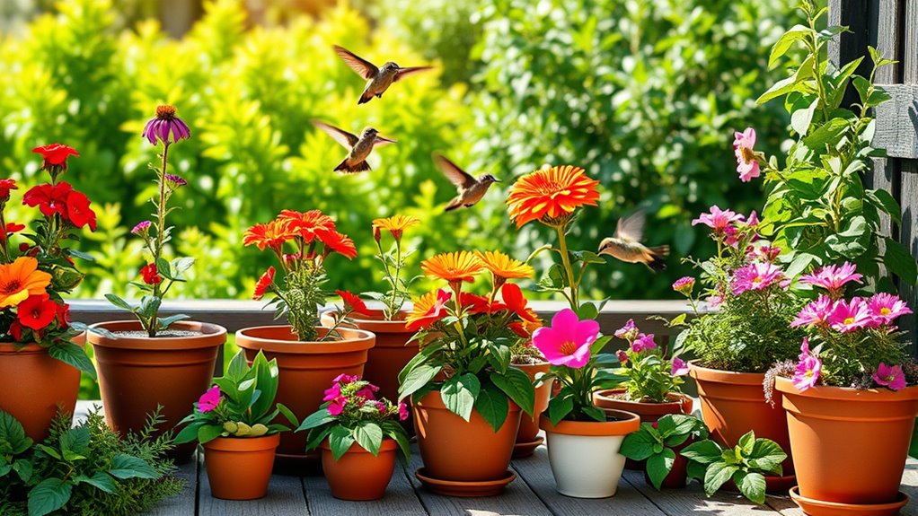 You’ll want to choose porous pots like terracotta or unglazed ceramic for hummingbird-attracting plants. These materials allow better airflow and drainage, which prevents root rot and keeps your plants healthy.